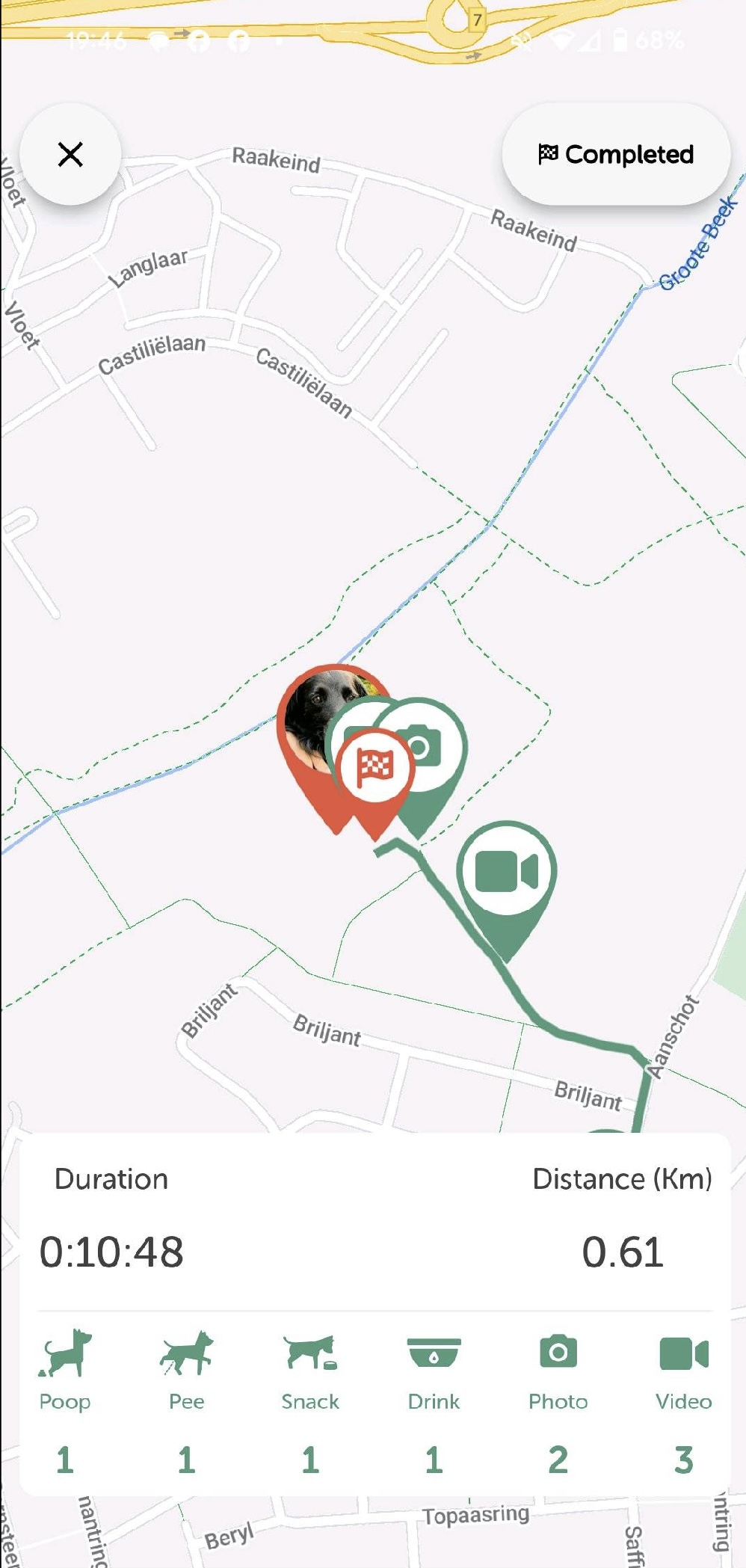 Zodra de wandeling is afgerond, kan de oppas een overzicht van de route, met eventuele gemarkeerde punten, delen via de chat met het baasje. Dit biedt een leuke en informatieve manier om het baasje op de hoogte te houden van de avonturen van hun hond.